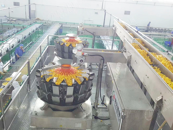 (2)按主機能力配置不同規模的連續化生產線。故蘿生產線視四道機(去皮、切端、通芯、括肉)的能力80個/min機分級規格進行配置。桃子生產線視桃瓣挖核機的能力70~80個/min及分級規格進行配置?;鹜壬a線能力750kg、1000kg、1500kg、2000kg進行配置。
